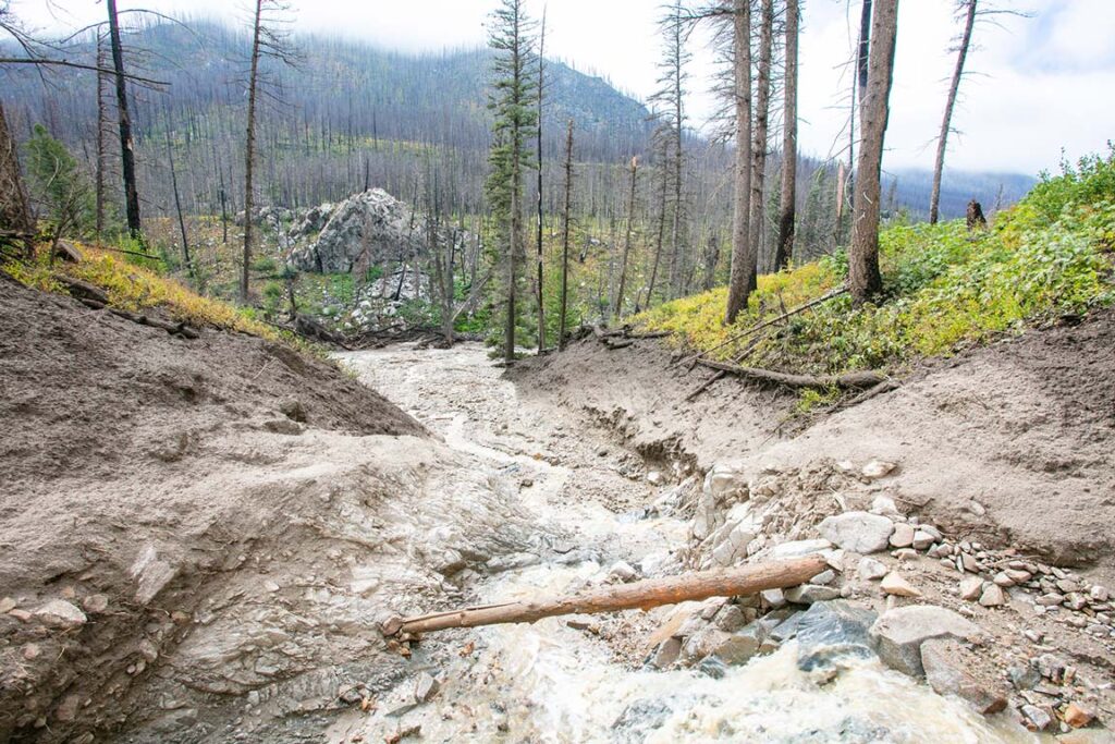 In August 2021, a lightning strike ignited the Boundary Creek Fire less than two miles west of the Boundary Creek boat ramp. The Upper Canyon’s topography, a mix of steep slopes and densely forested terrain, proved highly susceptible to active wildfire behavior. The fire spread along the river corridor, climbing tributaries and consuming vast swaths of forest. This event was a defining moment for the area, leaving the landscape primed for the erosional events that would soon follow.